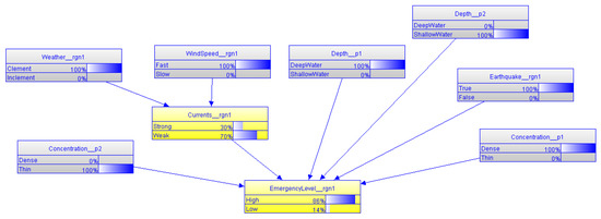 Beyond the capability of representing the specific scenario, the SWARMs ontology could also provide support for the MEBN reasoning in order to deduce the emergency level of the polluted sea region. The information encased in the SWARMs ontology could serve as valuable inputs for the MEBN reasoning. With information, including an earthquake occurred in the sea region, the weather above the sea region is clement, the wind speed is fast, H2S pollution 1 is found in deep water, H2S pollution 2 is found in shallow water, the concentration of pollution 1 is dense, and the concentration of pollution 2 is thin, the MEBN reasoning, shown in Figure 13, can infer that the pollution in the inspected sea region rgn1 is quite serious with a probability of 86%. Based on the reasoning result, marine biologists can have a more direct impression on the severity of the situation.