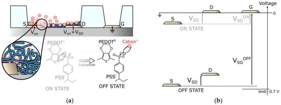 The PEDOT:PSS patches overlap the whole top area of the source and drain electrodes on a width of at least 10 µm in order to ensure the maximal injection of current in the channel. Based on a well-accepted mechanism [14], the channel conductance can be modulated upon source-and-drain/gate polarisation, such as the PEDOT semiconductor is dedoped from the PSS by reduction, supported by cations which penetrate the ionomer and chelate the sulfonates (see Figure 2a,b). Both the presence of labile cations and the device polarisation are essential but not sufficient in order to dedope the PEDOT.