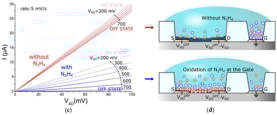 The electrical measurements of a source-centred OECT were performed with N2H4 at different electrical and chemical conditions, after the device was immersed overnight in deionised water (see Figure 3).