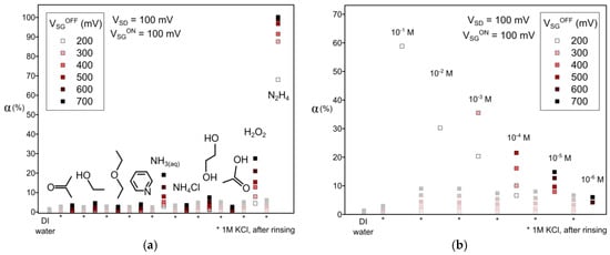 and fixing the values VSD and VSGON at 100 mV, the sensor shows current density modulations α(VSGOFF) below 3% with deionised water and 1 M concentrated KCl (see Figure 3). This demonstrates that the output is barely sensitive to the concentration of KCl in the absence of an electroactive analyte. Different analytes were successively introduced and tested on the OECT, followed by a rinse and test on a 1 M KCl concentrated blank (see Figure 3a). After each analyte test, the sensor recovered down to a α = 5 ± 2 at VSGOFF = 700 mV, indicating that the OECT was not damaged by any analyte. The sensor displayed α for acetone, ethanol, diethylether, pyridine, ammonium chloride, and acetic acid very near that of the blanks, showing the insensitivity of the OECT for 0.1 M of these analytes in water. A slight modulation with 0.1 M of ethylene glycol was observed, but without significant change in the PEDOT:PSS current density (since this analyte has the property to boost the conductivity of PEDOT:PSS [21], the lack of sensitivity to this molecule is of the highest importance). Moderated modulations with 0.1 M of aqua ammonia or hydrogen peroxide were observed. Confirming the applicability of H2O2 sensing with an OECT, it is worth noticing that other metabolites such as ammonia can also be detected at the same level. While 0.1 M of ammonia or hydrogen peroxide modulate with α = 25% ± 5% at VSGOFF = 700 mV, hydrazine promotes α = 65% ± 5% at as few as VSGOFF = 200 mV at the same concentration. The channel is completely closed with IOFF = 3 ± 2 nA when VSGOFF = 700 mV, resulting to α ≈ 100%.