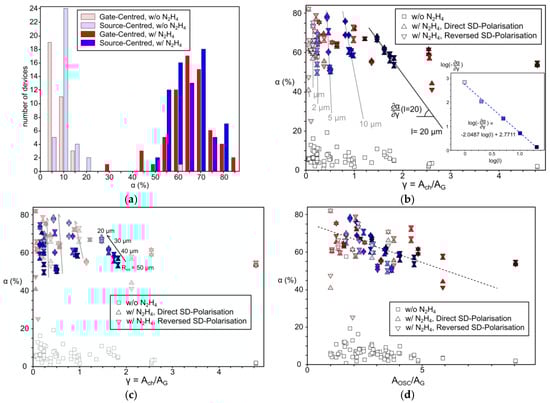 When plotting the sensitivity α against the geometric γ parameter of each device (see Figure 4b), one can distinguish a different amplitude for α of each OECT between operation with hydrazine and without hydrazine, showing all the devices to be operational and sensitive to it. Additionally, α of the OECTs with reversed SD-polarisation are similar to those of the direct SD-polarisation, indicating the insensitivity of α to the surface area of the hole injecting electrode, even for the largest Rint source-centred devices. For the source-centred, a trend for α to decrease linearly with γ can be seen for a given channel length, and the slope of this trend seems to be channel-length dependent.