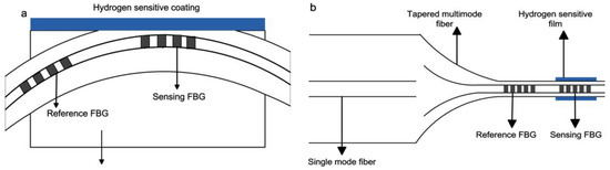 (a) Side-polished FBG (SPFBG) hydrogen sensor fixed on quartz substrate [27]; (b) Micro-FBG (MFBG) hydrogen sensor based on tapered multimode fiber [28].