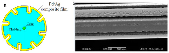 (a) Configuration of micro-machined FBG hydrogen sensor [34]; (b) SEM of micro-machined FBG coated with Pd/Ag composite film [34].