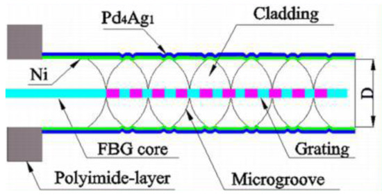 In 1999, the first Pd-based fiber Bragg grating (FBG) hydrogen sensor was proposed by Sutapun et al. [12]. The typical structure of the sensor is shown in Figure 1. FBG with cladding of 35 μm was evaporated with 560 nm of pure Pd film for hydrogen characterization. The sensor showed linear wavelength shift when the hydrogen concentration (in N2 atmosphere) ranged from 0.3% (v/v) to 1.8%. When the hydrogen concentration was over 1.8%, the hydrogen sensor deteriorated and became irreversible. The main reason for this phenomenon is due to the poor stability of pure Pd film. Additionally, the stress caused by Pd film is about three times greater than that of bulk Pd when the hydrogen concentration is between 0.5% and 1.4% at room temperature, which is a very interesting phenomenon.