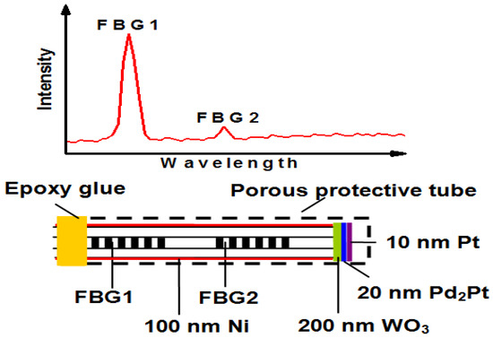 Configuration of FBG hydrogen sensor coated with Pt-loaded WO3 coating [43].