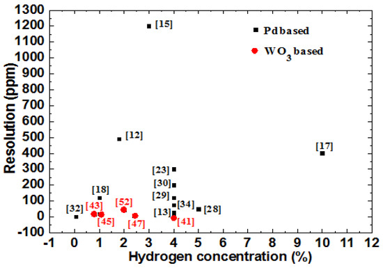 Comparison of the resolution of fiber grating hydrogen sensors based on Pd-based and WO3-based hydrogen sensitive materials.