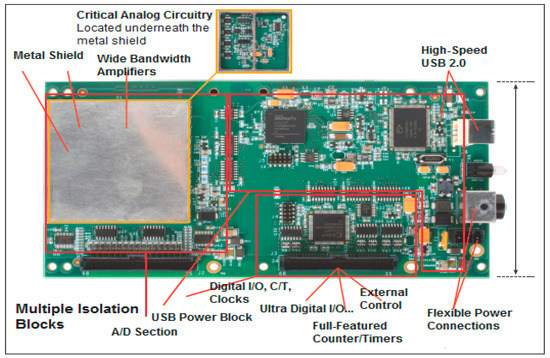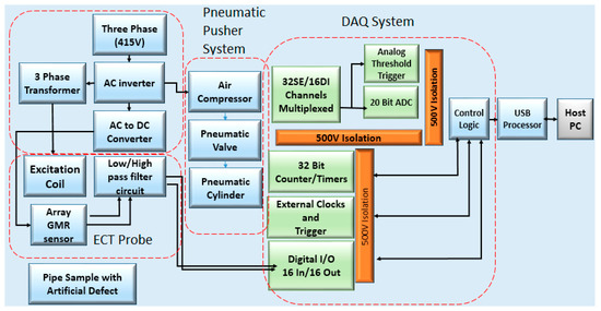 In order to accomplish the purpose of real-time defect inspection in ferromagnetic pipes, the DSECT system was designed base on a DT 9844 data acquisition board from Data Translation (Data Translation, Norton, Cupertino, CA, USA). The DT9844 is built to be highly accurate with 1 MHz sampling rate and it has a 20-bit resolution USB data acquisition module which offers incomparable efficiency in terms of its operation. In this module, the board has distinctive circuitry to lessen any possible crosstalk between channels. The ±500 V tri-sectional galvanic isolation allows the board to able to avoid any digital interference. This provides accurate analog signals that in turn ensure signal reliability. It is found that even for the most sophisticated applications, a high-performance measurement solution can be provided when the system is merged with the QuickDAQ software (Data Translation, Norton, Cupertino, CA, USA).