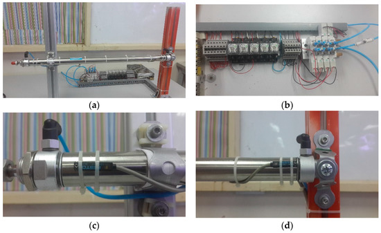 DSECT Pusher system (a) Hardware setup (b) Pneumatic system (c) Festo magnetic reed sensor at the end of cylinder (d) Festo magnetic reed sensor at the beginning of cylinder.