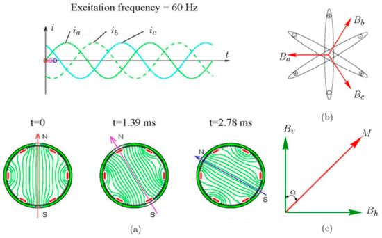 A three-phase AC power source is used to drive the excitation coil in order to generate a rotating magnetic field. In principle, the rotating magnetic field generated by the excitation coil probe will be sensitive to all types of defect, whether axial or circumferential. This is because the rotating magnetic field flux will be crossed over and intersected with all kinds of defects in the cylinder pipe. The rotating field principle is a fundamental property of all electrical machines and consists of three coils that are identical, located on axes that are 120 degrees physically apart and supplied from a balanced three-phase supply (i.e., the difference between the phases of exactly 120 degrees). An illustration of the magnetic field generated by each identical coil is shown in Figure 5.