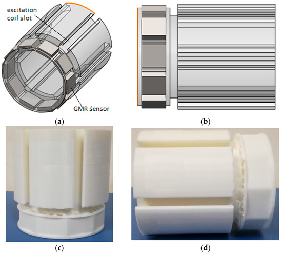ECT probe design for DSECT system based on optimum parameter design (a) Trimetric view (b) Left view (c) Probe prototype (d) Probe with GMR sensor.