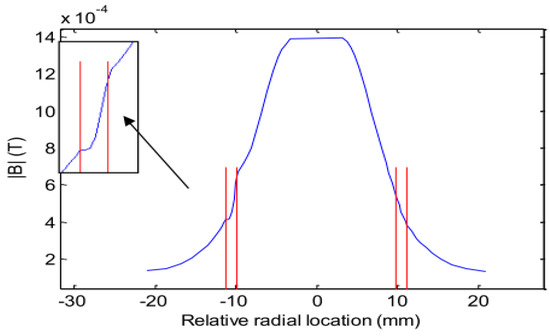 The magnetic flux density of the rotating field is uniformly distributed in the center plane of the windings (near the axis of the pipe), and decays exponentially in the radial direction, as shown in Figure 8, within the double red lines representing the pipe wall. The figure presents the magnetic flux density amplitude distribution along the radial direction on the plane of the pickup sensor. The presence of a through wall square hole (3.5 × 4 mm) in the pipe wall is shown in the zoomed-in area of the magnetic field on the left-hand side of the curve.