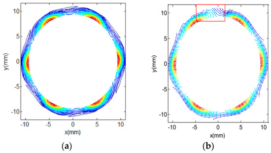 Amplitude contour of magnetic field component on the xy plane: (a) defect-free; (b) defect at 90°.