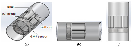 Array GMR sensor located at the ECT probe for pipe inspection (a) overall probe (b) side view (c) top view.
