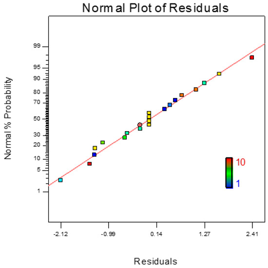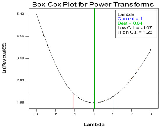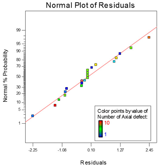 Figure 12 shows the normal probability plot for axial defect detection. It is noted that the values of the residuals are very small and closely fitted to the mean line shown in the graph. Therefore, the quadratic model is adequate for modeling the axial defect coefficients. Otherwise, the model should be power altered to other higher level polynomials for accurate results. Figure 13 shows the Box-Cox powers transformation for the axial defect model design. The axial defect RSM model is given by Equation (13) as their actual values: