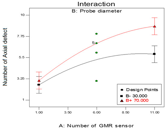 The interaction relationship parameter between the ECT probe size and the number of GMR sensors in the sensor array to the effect of detection axial defects during the pipe inspection is shown in Figure 14. From the graph, implementation of a maximum number of GMR sensor in the array sensor increases the number of axial defects detected by the ECT probe. The increase of defect detection is significant until the number of GMR sensors in the array of the sensor is 6. For an ECT probe with 30 mm diameter, the number of axial defects detected by the probe is not changed when the number of GMR sensors in array sensor is more than 6. The number of axial defects detected by the DSCET system decreases when the number of GMR sensors in the sensor array is more than 10. For the probe of 70 mm in diameter, the number of GMR sensors in the array sensor is between 1 to 6 sensors, which shows that the axial defects detected by the DSCET system increase almost linearly. However, this increase starts to reduce when the number of GMR sensors used in the array sensor is more than 10.