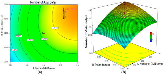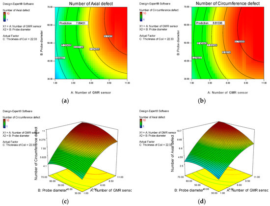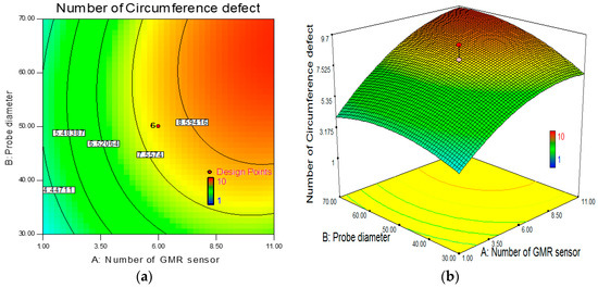 The effect of the diameter probe size and the number of GMR sensors in the array sensor, in relation to the effectiveness detection for the axial defect in an inspection of the carbon steel pipe is clearly shown in the 3-D surface and contour plot in Figure 15. With a coil thickness of 12 mm, the contour graph in Figure 15a statistically proposes the probe design diameter and number of GMR sensors used should be 53 mm and six GMR sensors, respectively. The probe diameter size is less than 45 mm which drastically reduces the detection of the axial defects detected by the DSCET system. This is because by decreasing the size diameter, the probe increases the lift-off distance on each GMR sensor in the array sensor. The cylindrical shape of the probe design led to an effective area detected by the GMR sensor. This is influenced by the edge angle of the cylinder, thus to maximize the defect detection in the pipe is optimal with regard to the GMR sensor that needs to identified. ANOVA analysis in Table 3 also shows the size of the probe diameter and the number of GMR sensors has a significant effect in determining the effectiveness of the DSCET system for axial defects in the attempt to detect defects during the carbon steel pipe inspection.
