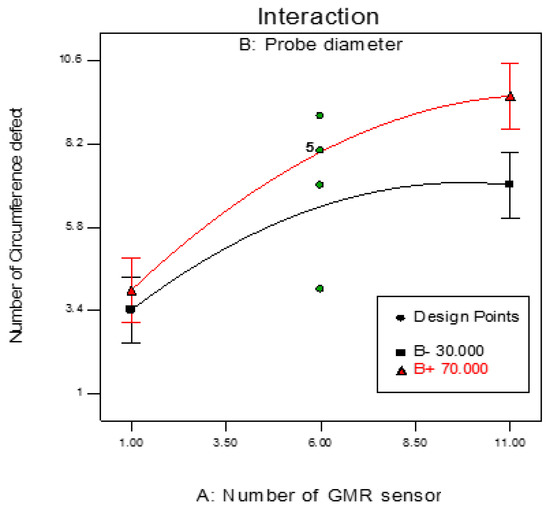 It can be seen that interactions between the probe parameter designs affect the variance of the circumference defect detection. Figure 16 shows the normal probability of circumference defect detection lies close to the mean line which evidences that the values of the residuals are marginal. Figure 17 shows the interaction between the factor involving the number of GMR sensors and probe diameter and the detection of the circumference defects. Therefore, all the parameters of the probe design are considered when optimizing the detection rate of the circumference defect.
