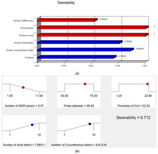 Optimization was applied by using the desirability profile and its functions in the RSM. The highest design parameters with high desirability were chosen as a final design for the ECT probe. The target was to maximize the number of defect detections for axial and circumference defects in pipe defect inspections and minimize the number of GMR sensors while the thickness of excitation coil and probe diameter were set in within a certain range of upper and lower limits for satisfactory results. A solution with high desirability is preferred. Table 1 shows the target value and the upper value for all the parameter responses.