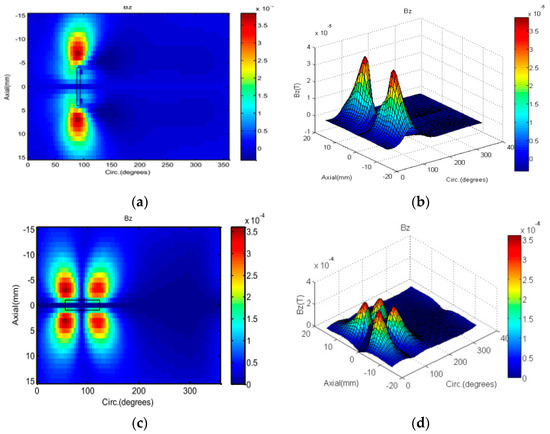 In finite element simulation, the measurements of GMR array sensor can be the axial, radial and azimuth mechanisms of the magnetic flux density. The radial and azimuth components Br and Bθ are computed as shown in Equations (11) and (12), whereas, the axial component is the same as Bz in cylindrical coordinates: