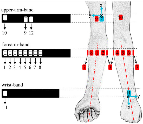 Schematic of the placement and orientation of the sensors in the experiment. The right upper limb is taken as an example to illustrate here. The red ones stand for EMG sensors, and the blue ones stand for IMUs. IMU’s z-axis is perpendicular outside to the plan.