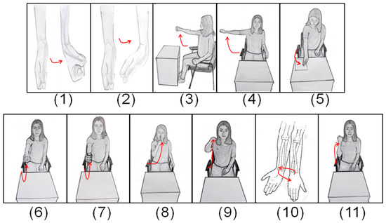 Sketch map of the canonical tasks (taking the right upper limb as an example): (1) wrist flexion; (2) wrist extension; (3) shoulder flexion to 90°, elbow at 0°; (4) shoulder abduction to 90°, elbow at 0° and forearm pronated; (5) flip a piece of paper; (6) fetch and hold a ball put on the table initially and keep shoulder flexion to 90°, elbow at 0° and palm down; (7) fetch and hold a cylindrical roll put on the table initially and keep shoulder flexion to 90°, elbow at 0°and palm towards the body; (8) finger to nose; (9) touch the back of the shoulder; (10) keep shoulder at 0°, elbow at 90° and palm down, then do supination/pronation of the forearm for twice; (11) flex elbow three times as fast as possible.