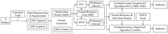 Figure 3 shows the data analysis procedure of the proposed framework. The entire evaluation procedure was introduced below: (1) Preprocess data and select segments corresponding to task performance; (2) extract features from each data segment; (3) perform preliminary evaluation using Pearson’s correlation coefficient (PCC) and dynamic time wrapping (DTW); (4) producing evaluation indicators using unsupervised algorithms or a supervised algorithm. Details concerning the data analysis procedure and implementation of the algorithm are provided below.