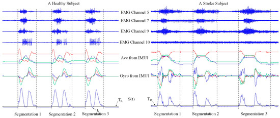 After the noise reduction, the recorded data were segmented by detecting both onset and offset of each task repetition. Our previous studies [20,21] successfully utilized EMG amplitude/energy from neurologically intact muscles of gesturers and signers for data segmentation by taking advantage of evident and consistent muscle activities during task performance. In this study, however, it was found that evident EMG activities were likely to present after task performance for stroke subjects due to their inability to fully relax as a result of impaired motor control. With this regard, we intentionally chose the data from both gyroscopes for data segmentation. Suppose that 3 axes of gyroscope signals are x1, y1, z1 for the IMU1 and x2, y2, z2 for the IMU2, respectively. The instantaneous summation of vector magnitudes from both gyroscopes was computed at each moment according to Equation (1). Then a magnitude thresholding approach was performed, where the threshold TR was set to be 3 degrees per second through many pretests. The onset time was determined to be the moment when S(t) rose over the threshold, while the moment when S(t) fell below and its following 2-s signals were kept below the threshold indicated the offset time. If S(t) momentarily fell down below the threshold within 2 s, the data within an entire task performance procedure could not be interrupted. Finally, the determined onset and offset were applied to all data channels (consisting of 10 EMG channels, 6 accelerometer axes and 6 gyroscope axes in total) to select a data segment corresponding to each task repetition. Figure 4 illustrates the data segmentation process in detail. The following feature extraction and motor function evaluation analyses were performed on these selected data segments: