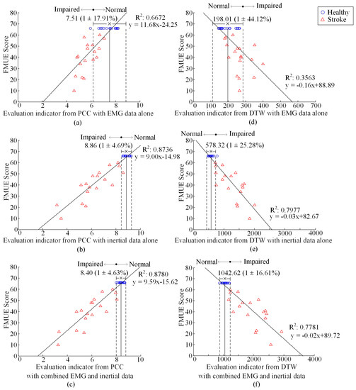 Plot of FMUE score versus the global EI, from PCC (a–c) and DTW (d–f) with EMG data alone (a,d), inertial data alone (b,e) and combined data (c,f), respectively. R2 reports the coefficient of determination from the linear regression analysis. The ‘×’ and the bar denote the mean and 1.96-times SD of the healthy subjects’ EI. The range between the two dashed lines over the horizontal axis represents the normal range. Circles and triangles represent data from individual healthy and stroke subjects, respectively.
