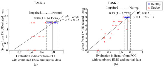 The results of motor function evaluation for specific task were also analyzed after assessing the global function of upper limb. Figure 6 reports component EIs from the PCC for the TASK 3 and TASK 7, both used as representative examples, respectively, with combined EMG and IMU data. With similar result representation as Figure 5, it can also be found from the Figure 6 that the healthy subjects have component EIs concentrated within a relatively small range whereas the EIs from the stroke subjects tended to deviated from the normal range. Specifically, the NDVR for TASK 3 and TASK 7 were 14.15% and 7.72%, respectively. By performing regression analysis, the DC reached into 0.4658 for TASK 3 and 0.8121 for TASK 7 respectively.