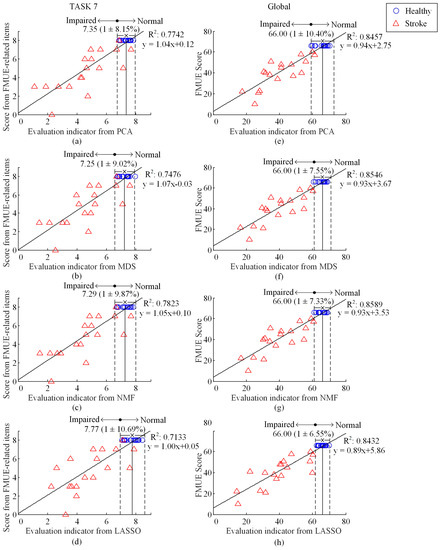 Plot of score of FMUE-related items versus the EI for TASK 7 (a–d), and plot of FMUE score versus the EI (e–h), using PCA (a,e), MDS (b,f), NMF (c,g), and LASSO (d,h), respectively. All symbols and lines appear in the same way as illustrated in Figure 5.