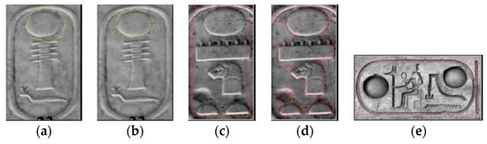 Other methods as Statistical Shape Models (SSM), Active Shape Models (ASM), and Active Appearance Models (AAM) are used to find objects with a similar shape using key points or landmarks and the textures between these landmarks [18,19]. These methods work better when there is a clear difference between the object and the rest of the image. In this work, the hieroglyphs have the same color than the rest of the cartouche, and the edges are very soft. Figure 2a,b shows an example of AAM method. Other approach implements a skeleton search using a Skeletal Shape Model for object segmentation and recognition that works directly on real images [20]. A fragment-based generative model for shape that is capable of generating a wide variation of shapes as instances of a given object category is proposed. It develops a progressive selection mechanism to search among the generated shapes for the category instances that are present in the image. This method seems to be robust against spurious edges, missing edges, and accidental alignment between the image edges and the shape boundary contour. The segmentation of the object using global holistic properties of object shape is proposed in [21]. Concretely, it proposes a figure/ground segmentation method for extraction of image regions that resemble the global properties of a model boundary structure and are perceptually salient. Its shape representation, called the chordiogram, is based on geometric relationships of object boundary edges, but this work takes into account the perceptual saliency in favor of coherent regions distinct from the background. A new weighting function, which helps constructing words representations for detection of Maya hieroglyphs is introduced in [22]. This weighting function depends on the ratio of intersection of the local descriptors, and their respective distances to the center of the bounding box that is under evaluation. The Active Contours Algorithm was also tested in order to detect the edges of the Egyptian cartouches used in this work [23,24]. Figure 2c–e shows an example. Its performance was not suitable in terms of time.