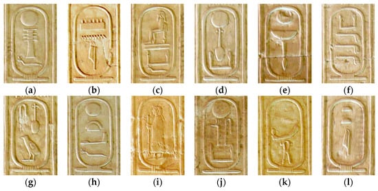 After analyzing the contents of the evaluated cartouche, a list of hieroglyphs with their positions is delivered. According to the procedures about Egyptian writing interpretation presented at the beginning of this section (i.e., studying the image from top to bottom and from left to right), the sequence of the hieroglyphs is read (see Figure 11).