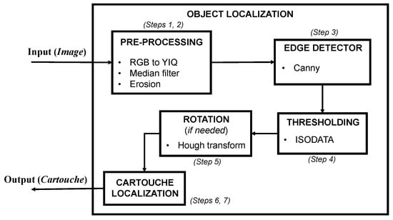 Step 7. Once the limits of the cartouche are calculated, each Region of Interest (ROI) will be extracted. In this work, each ROI corresponds to a hieroglyph and is always located within a cartouche in the image. Figure 6d,e shows the recognition of the cartouche borders and the ROI extraction process, respectively. Differences between hieroglyphs and cartouches are not remarkable because a similar model was used by Egyptian scribes. The ROI extraction process is described in Section 2.2. As a summary, Figure 7 shows a scheme of the object localization process described in this section.