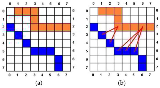 On the other hand, Hausdorff distance is different because it only considers the greatest of all the distances from each point in the contour of object A to the closest point in the contour of object B. It is obtained as in Equation (3); firstly, calculating the minimal distance for each point of one edge to another edge and finally, selecting the maximum of them: