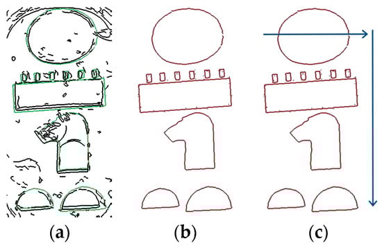 Table 1 shows the results of Chamfer and Hausdorff distances once compared the hieroglyph in Figure 8a to the three hieroglyphs in Figure 8b–d. One can observe that lower distances, and therefore a better matching, are achieved for the hieroglyph in Figure 8d. Following the technique previously mentioned, an approximation to the Euclidean distance using Chamfer method is used. The extraction and identification of each hieroglyph is carried out by means of the following steps.