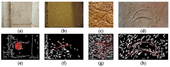 The location process applied to search for stonemason’s marks: (a–d) original images; (e–h) localization process results.