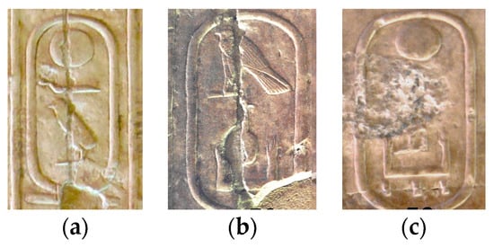 The effects of time, exposure and even vandalism make the recognition process difficult: (a) Khufu’s cartouche; (b) Neferkahor’s cartouche; (c) Qakare Ibi’s cartouche.