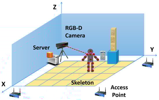 Aiming to deliver a new strategy for enriching the experience of users visiting a museum, this method can be combined with a positioning system. According to the approach presented in [31], a combination of sensors of different nature, such as RGD-B cameras and WiFi positioning systems (as shown in Figure 15), are employed to accurately locate users in an interior environment. Every access points (i.e., routers) spread in the facilities sends wireless signals that are received by the portable devices—usually smartphones—carried out by users. The Received Signal Strength Indication (RSSI) in each point is used to estimate the position of people in the museum. The identification of 3D skeletons by means of RGB-D cameras is combined with WPS data, making more precise this positioning.