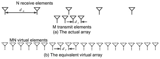 As shown in Figure 1, the MIMO imaging radar with M TEs and N REs can provide MN individual observation echoes from the targets. The virtual array theory demonstrates that every MIMO array can be considered equivalent to a virtual array whose one-way beam pattern is identical to a two-way pattern of the initial array [25]. It can be treated as a receive aperture with the object illuminated by a single transmitter. Denoting the position vectors of the m-th TE (transmit element) and the n-th RE (receive element) as and , respectively, the phase delay of each echo is the interacted result of the positions of TE and RE, which equals to the phase of the signal from a virtual element with the position vector . Therefore, the processed signals of MIMO array are the same with those of an equivalent virtual array whose elements are located at: