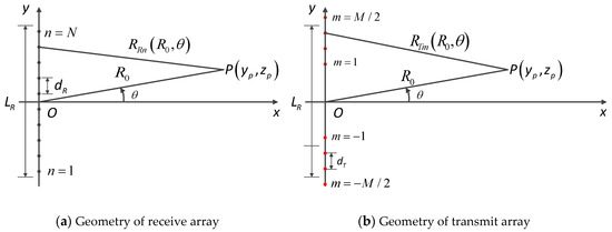 Similar to the traditional array radar, the far-field condition of a MIMO radar should be calculated first. As is shown in Figure 4, the target is located with the distance and azimuth angle from the center of the receive array. Based on the cosine theorem, the target’s distance from the n-th RE, , can be expressed as follows: