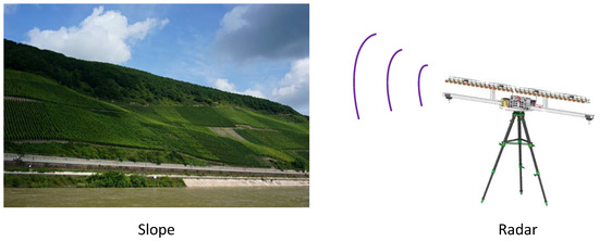 Ground-based Synthetic Aperture Radar (GB-SAR) is a kind of radar system which can realize two-dimensional high-resolution imaging by linear motion on a slide rail with synthetic aperture technology [1,2,3,4]. It is widely used in the field of slope monitoring [5,6] due to its ability to measure tiny deformations accurately with differential interferometry technology. Nevertheless, because of its need for a slide, the radar system, which is difficult to move with its complex structure, has very high terrain flatness requirements. Meanwhile, the system’s imaging interval is too long to measure vibrations.