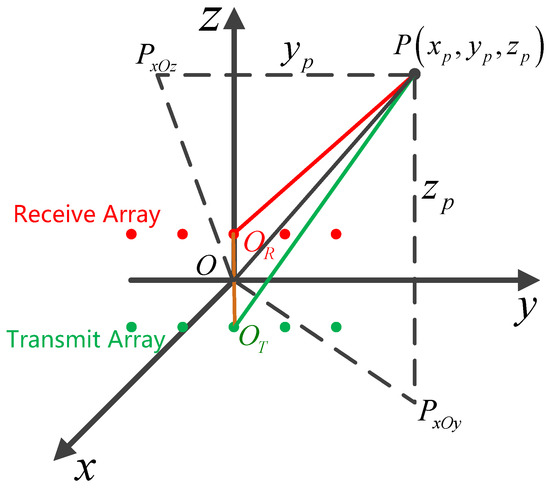 As is shown in Figure 6, it is assumed that the transmit array is lower than the receive array and the height difference marked by a brown line is . Establish a coordinate system with the average of the T/R arrays’ centers as the origin . In this coordinate system, T/R arrays are in the y-O-z plane and both parallel to y-axis, thus TEs are located at and REs are located at . Considering a target at , it is located at in the spherical coordinate system () and its azimuth angle is , where is the angle operator of two vectors, and are the projection points of in x-O-z and x-Oy plane, and is the unit vector in x-axis direction. Mark the centers of T/R arrays as and , respectively, then the distance from the target to the center of receive array is and the azimuth angle to the receive array is . Similarly, the distance of transmit array is and the azimuth angle to the transmit array is . When the target is with the average height of the T/R arrays, it is obvious that: