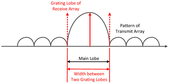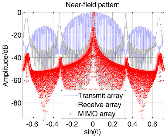 Under the far-field condition, the grating lobes of the sparse array’s pattern are canceled out by the nulls of the dense array’s pattern completely and no grating lobes appear. However, both the dense and the sparse arrays’ patterns will produce significant distortions under near-field conditions, resulting in grating lobes on the MIMO array’s pattern. Figure 8 shows the near-field pattern at 30 m of a MIMO array with an equivalent virtual array length of about 4.75 m, in which the grating lobes are obvious.