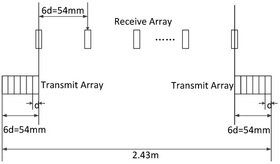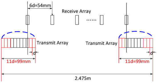 To verify the validity of the proposed design methods, this section includes two simulations performed using Matlab. The adopted far-field MIMO array is shown in Figure 10. The transmit array is a dense ULA, and is divided into two sub-arrays placed at both ends of the sparse receive ULA. The parameters used in the simulations are shown in Table 1.