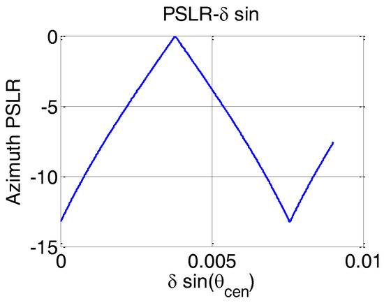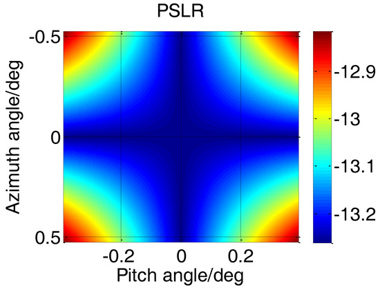 However, Equation (15) is no longer valid when the target’s height does not equal to the average height of T/R arrays. In this case, the peak position of the T/R patterns will shift to a certain extent from the ideal position to , resulting in high side lobes in the azimuth angle dimension. As is shown in Figure 7, the offset leads to the increase of PSLR, so the PSLR will be selected as the imaging reference in the following analysis.
