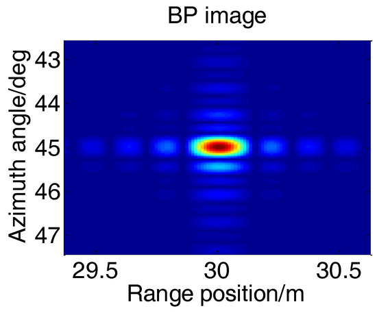 Although the overall imaging performance has been verified by outline comparison, the specific parameters of the point target imaging still need to be analyzed. In former BP images, two-dimensional Hamming window are added for better focus, but it is not necessary in the following analysis of point target imaging. The BP image of the left corner reflector without window function is shown in Figure 22 and its angular profile at the maximum value is presented in Figure 23.