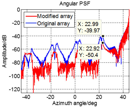 Adjusting the transmit array without changing the interval between two nearby elements, we can get the new array shown in Figure 15. The angular PSF of the edge point is shown in Figure 16, from which the level of maximum grating lobe is −50.4 dB. Obviously, the validity of the proposed method is verified by this simulation.