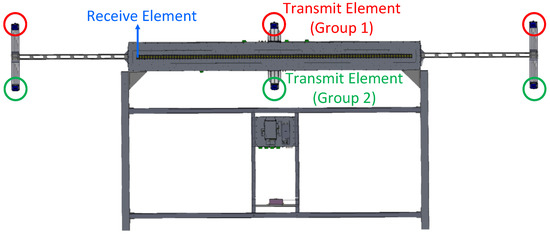 The MIMO array used in the experiment with the parameters listed in Table 2 is shown in Figure 17, in which the TEs are labeled by red circles and green circles while one of the 96 REs is labeled by a blue arrow. Although there are six TEs in this system, only the three TEs in group 1 labeled by red circles are used. If all TEs are processed together, the height of targets can be measured by interference technology, which is beyond the scope of this paper.