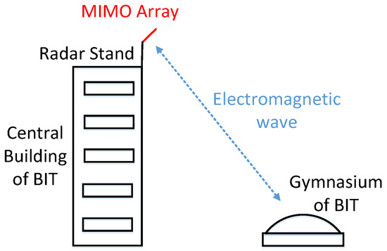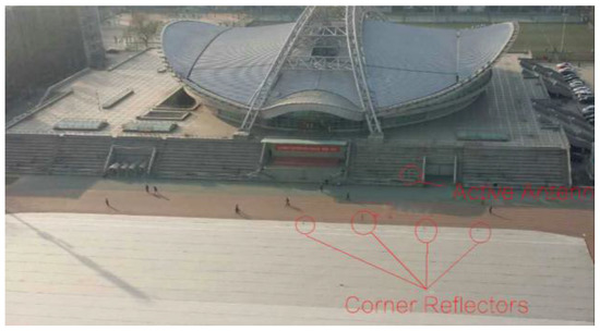 This experiment was performed in Beijing Institute of Technology (BIT). As is shown in Figure 18, the radar was arranged at the top of the central building, and the antenna was directed at the gymnasium. It should be noted that the arrangement of the array antenna is perpendicular to the observation surface in Figure 18, and the red line is the baseline of the two groups of TEs. Figure 19 shows the scene of this experiment. The main building in the scene is the gymnasium of BIT, in front of which there are four corner reflectors and an active antenna.