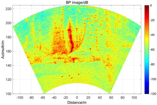 With three TEs and 96 REs, there are 288 individual observation channels in this system. After processing the echoes by BP (backward projection) algorithm, a radar image in dB can be obtained, shown in Figure 20. From this picture, the outline of the gymnasium, the platform below the gymnasium and four point targets corresponding to the corner reflectors can be clearly seen. The length of the gymnasium is about 100 m and the distances from the array to the corner reflectors are about 120~130 m. In particular, the active antenna does not appear in the image because it is placed for calibration and closed after that.